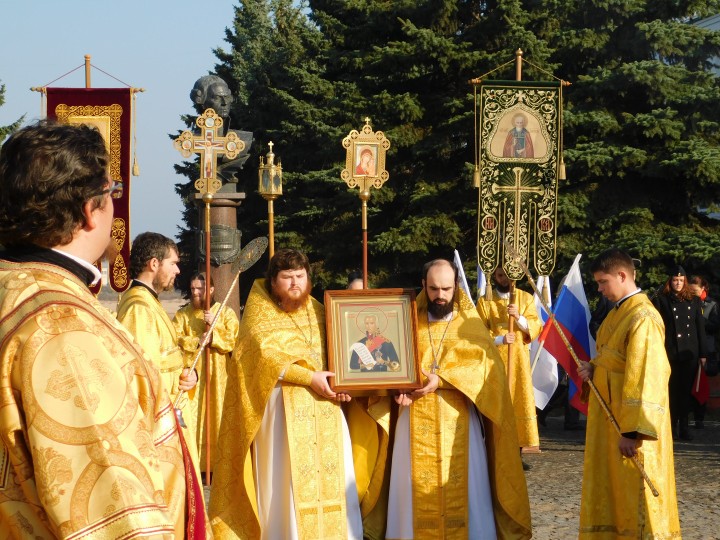 По заведенной традиции в Спасо-Преображенском соборе, где один из приделов посвящен святому праведному воину Феодору Ушакову, прошла литургия, после которой священники вынесли из храма святыню – написанную рыбинской художницей Ириной Андреевой в 2004 году икону с изображением адмирала с частицей мощей праведника.