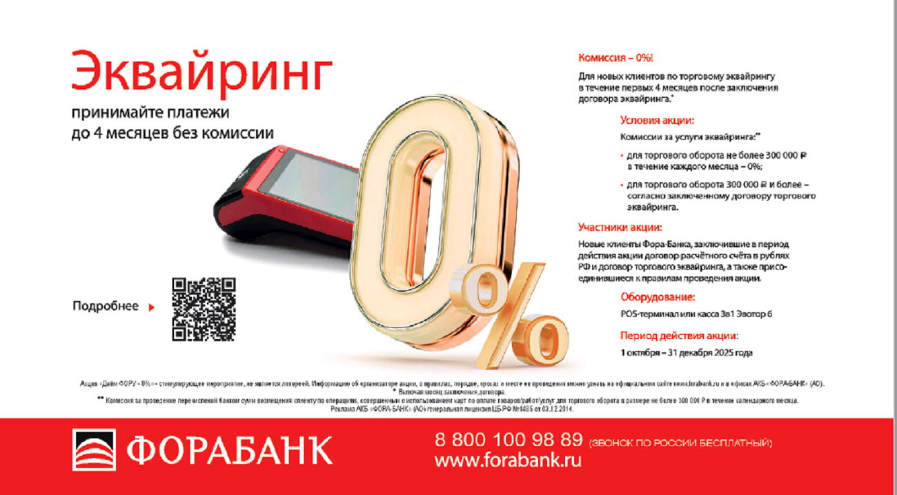 При открытии бизнеса важно минимизировать первоначальные затраты. И Фора-Банк помогает начинающим предпринимателям сэкономить, пример – наша акция «Даём ФОРУ». Мы предложим новому клиенту всё, что нужно для комфортного приема оплаты товаров или услуг компании – это оборудование, современные технологии эквайринга, включая онлайн-кассы 3в1 и QR-эквайринг. Кроме того, расчетный счет для бизнеса можно открыть бесплатно.