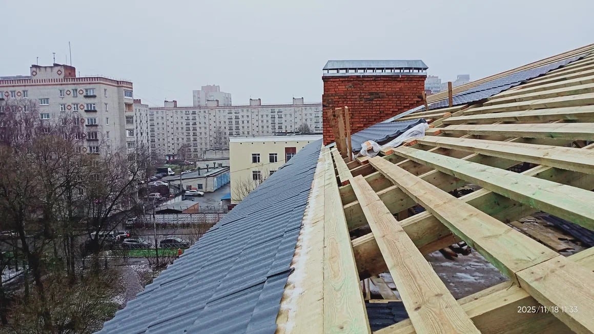 Начались они в сентябре, и на сегодняшний момент уже демонтажные работы завершены на 90%, полностью собрана стропильная система, начата укладка нового кровельного покрытия.