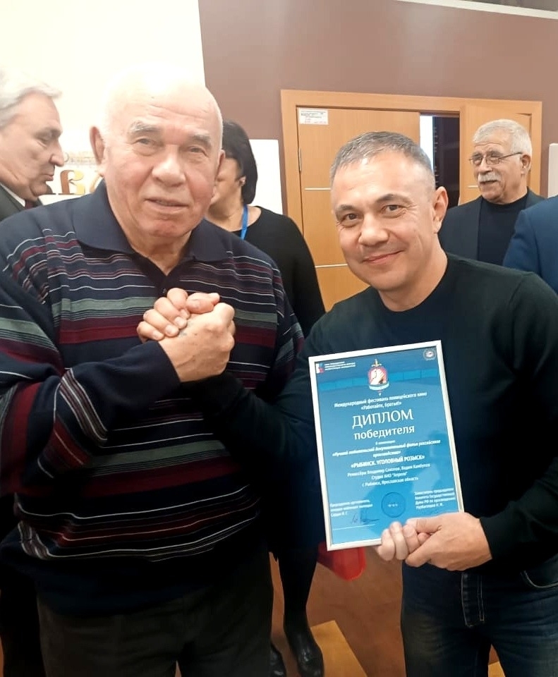 Диплом победителя кинофестиваля «Работайте, братья» из рук абсолютного чемпиона мира (по версиям WBC/WBA/IBF) среди профессионалов Константина Дзю принимает режиссёр фильма «Рыбинск. Уголовный розыск» Владимир Соколов.