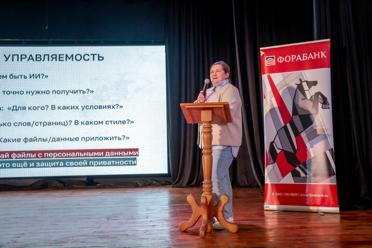 Конференция началась с выступлений экспертов в области искусственного интеллекта (ИИ). О примерах применения ИИ на практике ребятам рассказала руководитель лаборатории электронного контента ЯГПУ им. К.Д, Ушинского Татьяна Рицкова. Выступление Мавзуны Гафоровой, начальника отдела фрод-мониторинга Фора-Банка было посвящено «темной» стороне ИИ – ловушкам использования нейросетей. Дарья Савченко, ученица 8го класса образовательного комплекса №16, который 2 года подряд становился региональным лидером акции «Цифровой Я», поделилась с участниками своим креативным опытом использования ИИ.
